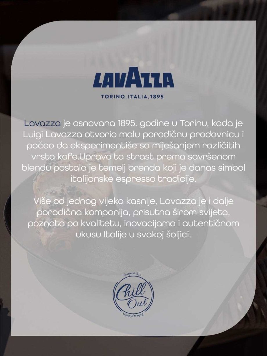 U ChillOutu nema kompromisa. Lavazza je jedina kafa koja se služi u ovom lokalu. Nema zamjena i nema odstupanja od kvaliteta. Svaka šoljica priprema se sa pažnjom, jer kafa ovdje nije samo napitak, već dio identiteta mjesta.