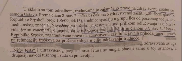 “Jedan genetski neinvazivni test koji pomaže u praćenju i održavanju trudnoće može da se podvede pod kategorije pravovremene dijagnostike, sprečavanje oboljenja, blagovoremeno liječenje i slično”, jasna je Stankovićeva i dodaje da je još prije nekoliko godina Vrhovni sud RS potvrdio ono što piše u Ustavu, a to je da da tri kategorije stanovništva imaju pravo na zdravstvenu zaštitu iz javnih prihoda neposredno na osnovu Ustava: trudnice, stara lica i djeca, dok se za ostale kategorije stanovništva to detaljnije uređuje zakonom.