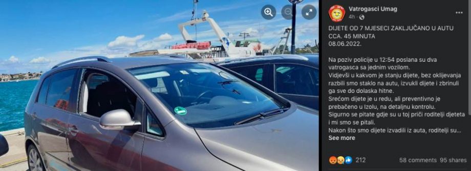 Vatrogaci iz Umaga su na društvenim mrežama objavili da je beba, koja je u zaključanom automobilu bila oko 45 minuta, zbog predostrožnosti detaljno pregledana.