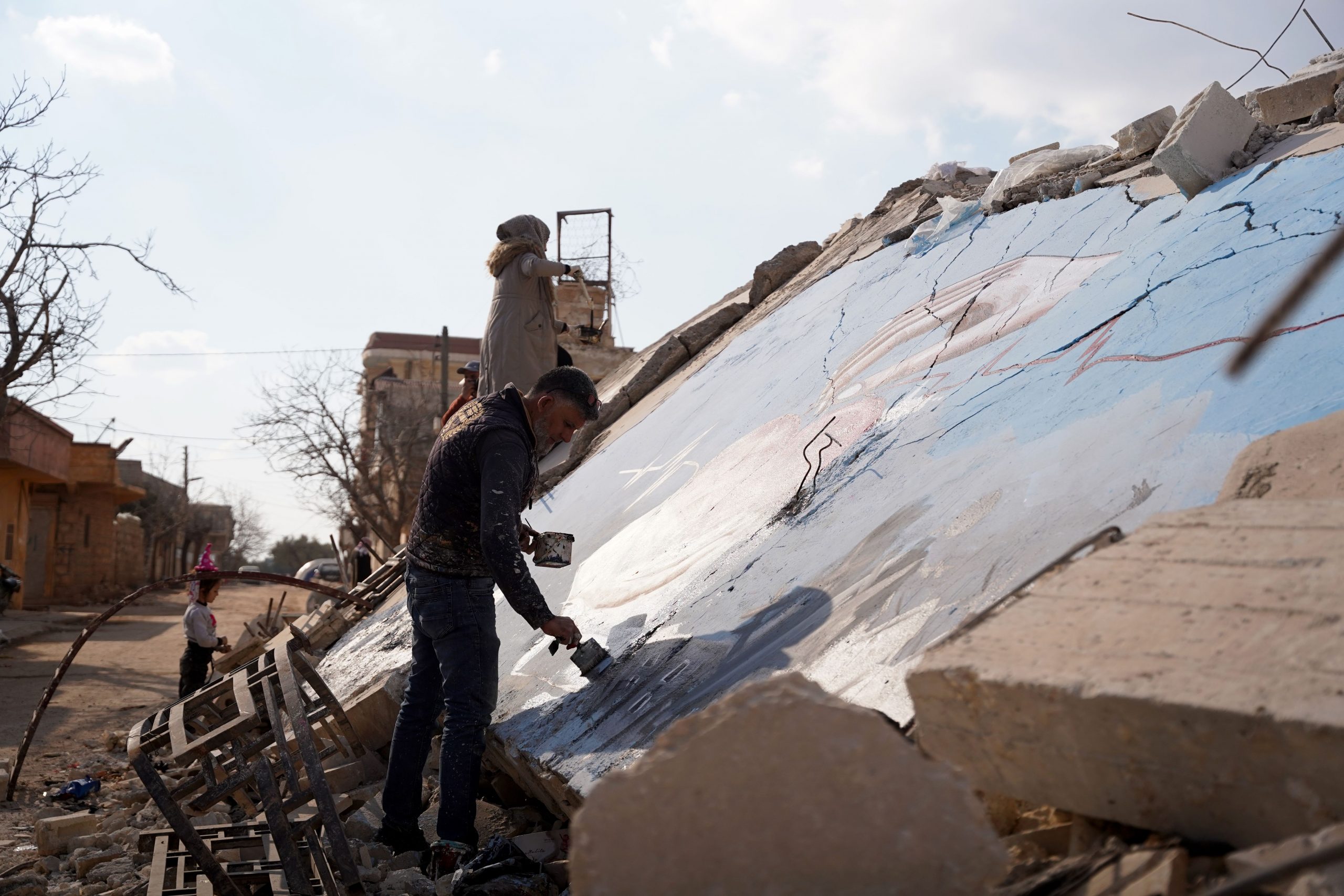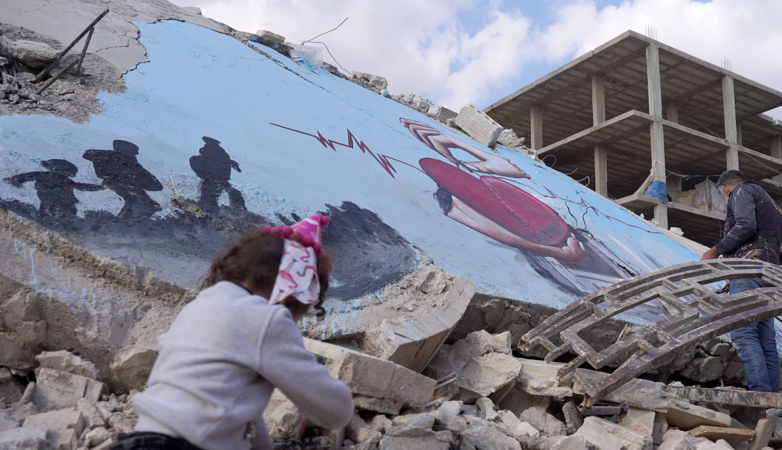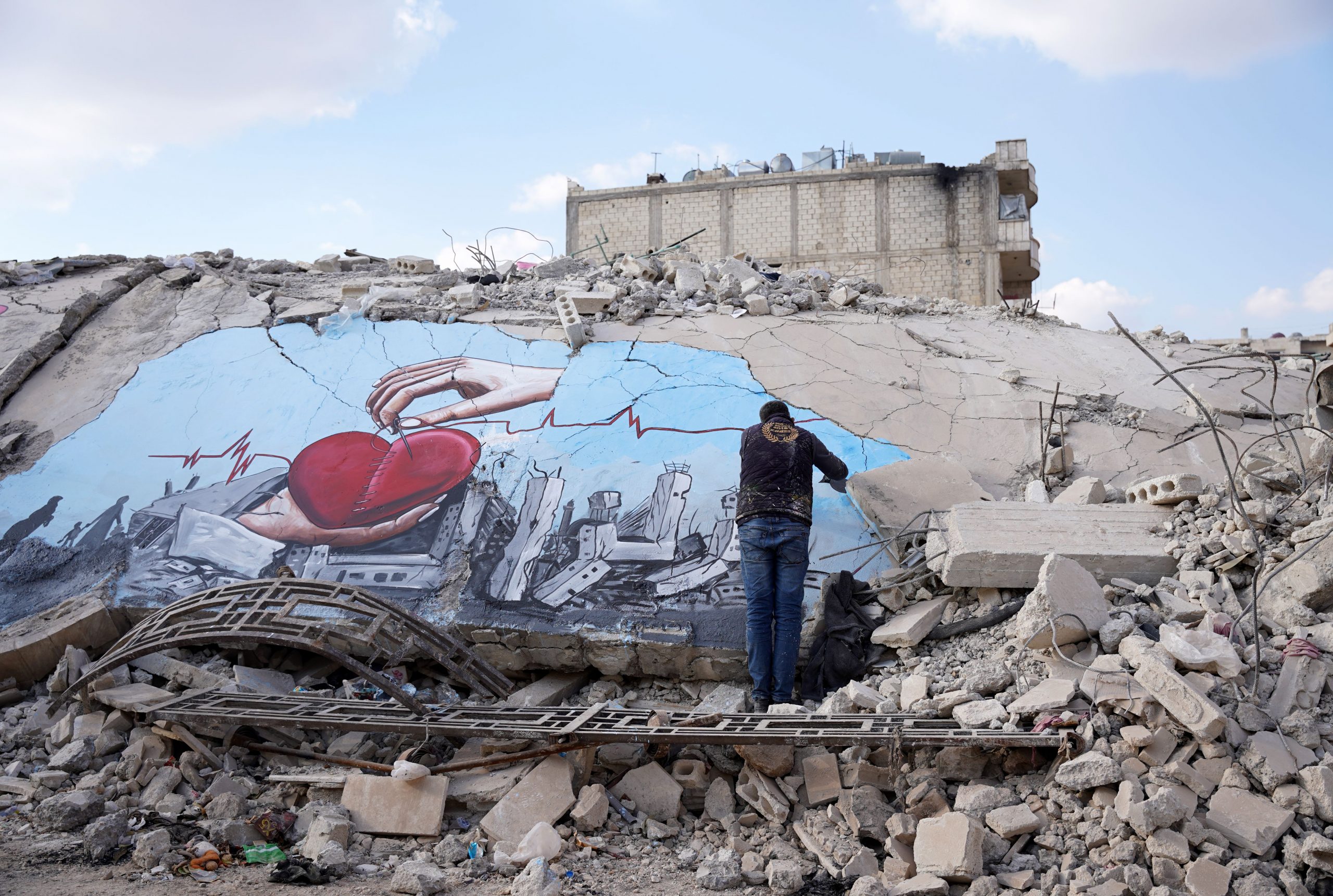 Mural je naslikan na ruševini u četvrti Cinderes koja je među najteže pogođenim zemljotresom u Afrinu.
