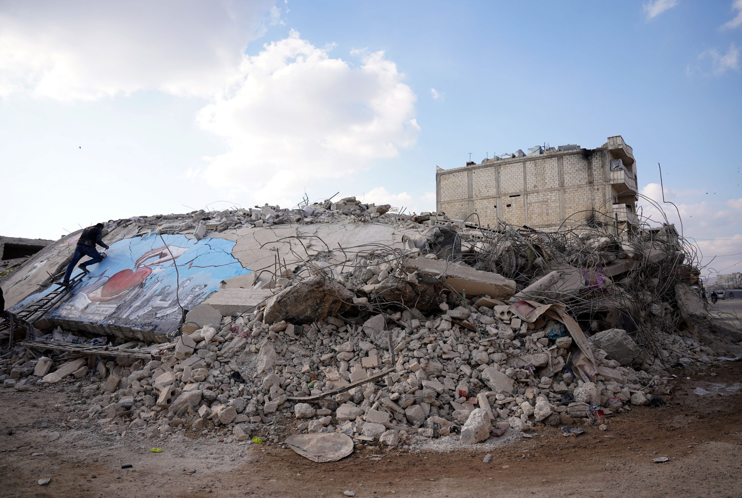 Mural je naslikan na ruševini u četvrti Cinderes koja je među najteže pogođenim zemljotresom u Afrinu.