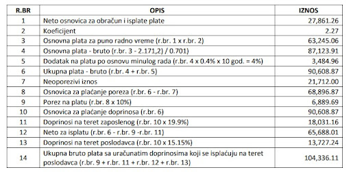 U nastavku je prvo primjer obračuna plate na radnom mestu “mlađi poreski savjetnik“ koji prema Pravilniku o platama i drugim primanjima zaposlenih u ministarstvu finansija – poreska uprava spada u V platnu grupu sa koeficijentom 2,27.
