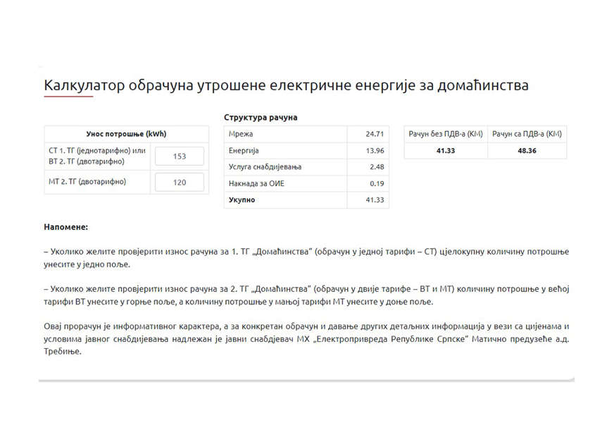 Po novom obračunu, za istu potrošenu količinu račun bi iznosio veći oko dvije marke, odnosno 138,08 KM (118,01 bez PDV). Na mrežarinu se odnosi 56,11 KM, na energiju 58,11 KM, na OIE 0,59 KM i 2,48 usluga snabdijevanja.