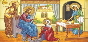 Poslije vaskrsenja Lazarevog, a na šest dana prije Pashe, Gospod Hristos je bio u Vitaniji na večeri kod Simona prokaženog, i tu Mu je Marta služila, a Marija pomazala skupocenim mirom noge i vlasima glave svoje otrla (Jn. 22, 1-8; Mat. 26, 6-13; Mr. 14, 3-9). Marta i Marija su i ranije ugostile Gospoda u domu svome, gdje im je Gospod održao divnu pouku o „jedinom što je na potrebu“ (Luk. 10, 38-42).