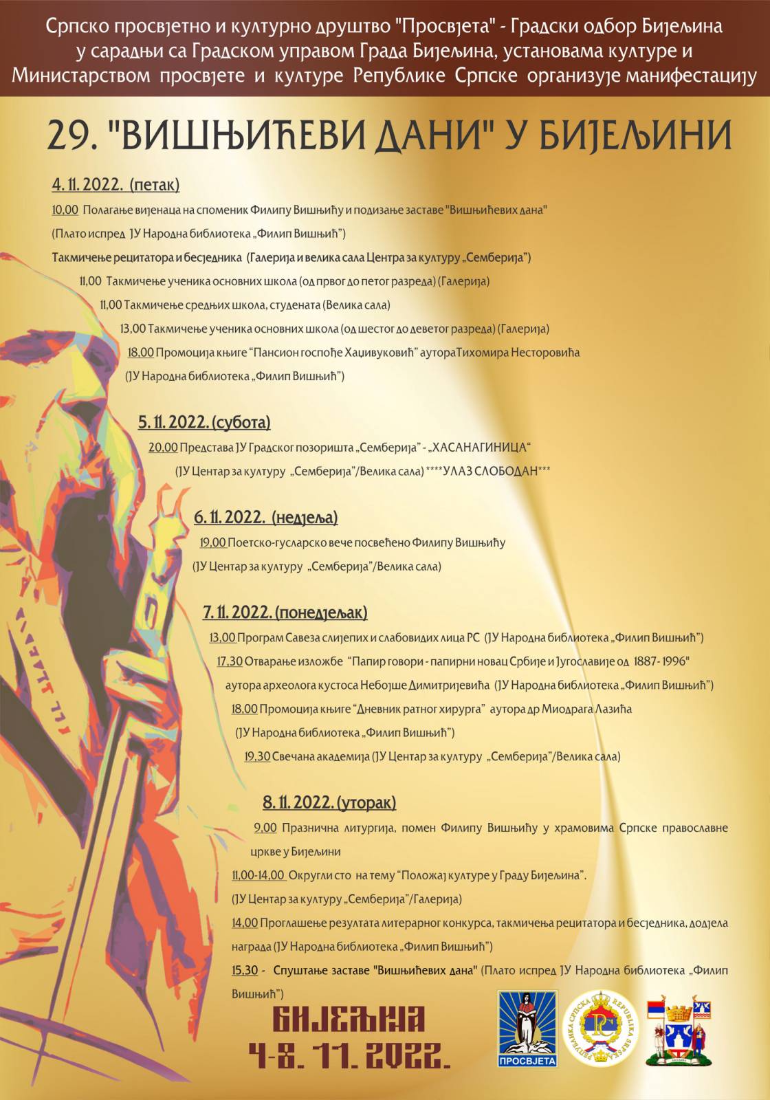 Tradicionalno, biće održano takmičenje recitatora i besjednika za učenike osnovnih i srednjih škola, kao i okrugli sto o položaju kulture u Bijeljini. “Višnjićevi dani” počinju u petak, 4. novembra, u 10.00 časova, polaganjem cvijeća na spomenik Filipu Višnjiću i podizanjem zastave manifestacije na gradskom trgu u Bijeljini.