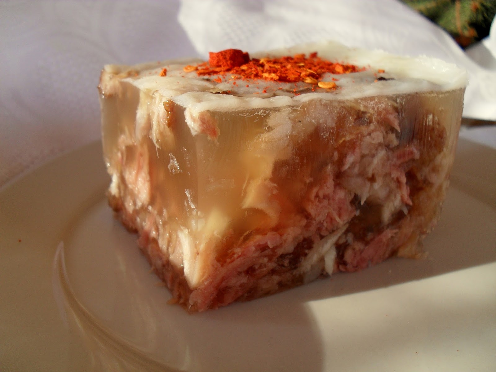 Prohlađenu smjesu procedite kroz gusto sito, a meso i kosti ostavite sa strane i isjeckajte na komade željene veličine. Isjeckano meso rasporedite u dublje tanjire, preko nasjeckajte bijeli luk i u svaki tanjir nalijte procijeđenu tečnost. Tako pripremljene pihtije ostavite na terasu ili u frižider da se hlade preko noći. Prilikom serviranja pospite ih ljutom mljevenom paprikom.
