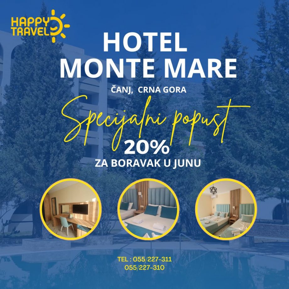Akcijsko sniženje od 20% za boravak u junu odnose se na Crnu Goru i smještaj hotelima Monte Mare 4* Čanj, Mediteran 4* Bečići i Talia 3* Igalo.