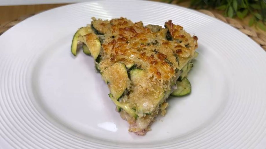 Operite tikvice, odstranite krajeve i isjecite ih na kolutove. Ubacite ih u veću činiju, posolite, dodajte maslinovo ulje, prezle i rendani sir. Sve dobro promiješajte rukama.Posudu za pečenje nauljite i pospite prezlama. Sipajte dio tikvica, a zatim poređajte listiće šunke, pa listiće dimljenog sira. Sipajte preostale tikvice, poravnajte pospite prezlama i maslinovim uljem. Pecite u unaprijed zagrijanoj rerni na 200°C oko 25–30 minuta, dok površina ne postane zlatno-hrskava. Poslužite toplo ili mlako, uz sezonsku salatu ili jogurt.