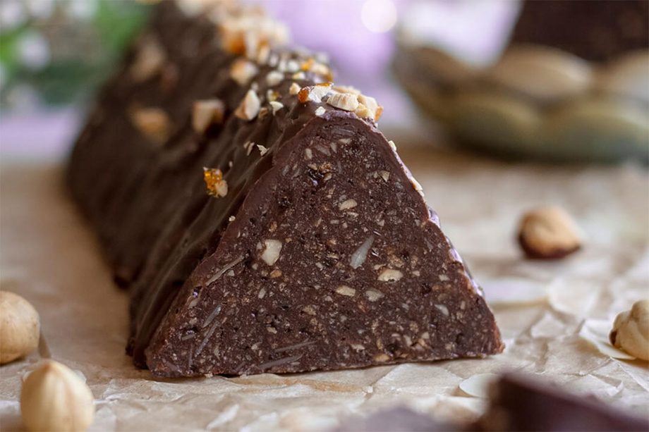 Pripremite trouglasti kalup, dužine 37 cm i visine 5,5 cm. Unutrašnjost kalupa obložite prozirnom folijom. Kalup napunite smjesom, utisnite ravnomjerno i poravnajte. Ostavite na hlađenje nekoliko časova u frižider. Ohlađen kolač izvadite iz prozirne folije i prelijte glazurom od 70 g otopljene čokolade sa malo ulja, po želji dekorišite mljevenim lješnicima.