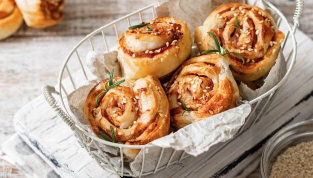 Sve što je potrebno jeste da odmrznuto tijesto razvijete oklagijom i preko naređate šunku, kačkavalj, ili bilo šta po vašoj želji, zarolate, isiječete na male krugove i ispečete.