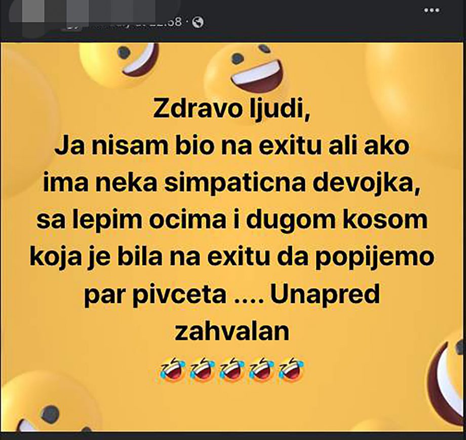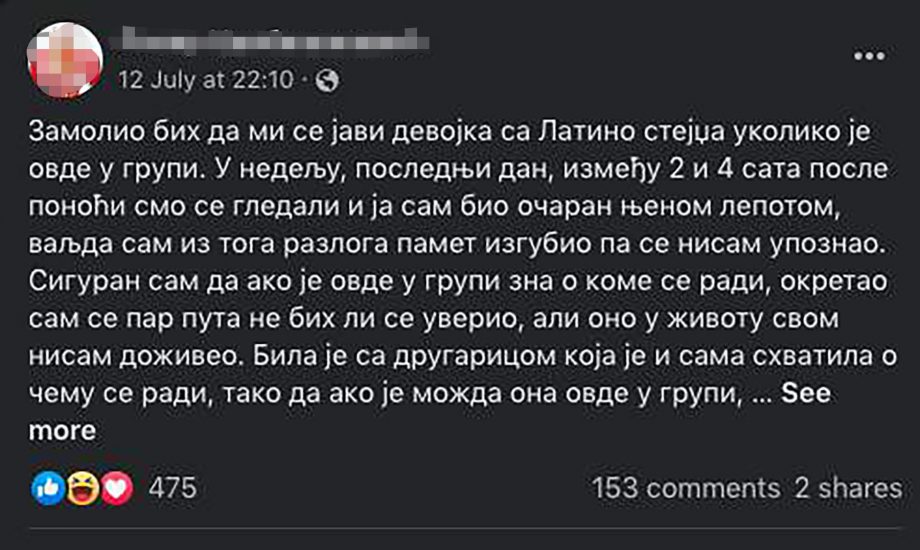Bila je sa drugaricom koja je i sama shvatila o čemu se radi, tako da ako je možda ona ovdje u grupi, molim da se javi, da me spasi ove tuge. Drugarica je imala šiške i crnu kosu, a devojka koju tražim oči kakve za života nisam vidio, gdje od očiju, ništa drugo ni nisam. Bila je blago našminkana i imala je one šljokice. Hvala i svako dobro“ – glasi njegov post.