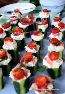 - Na vrh staviti krišku tanko rezane pršute i polovinu čeri paradajza.