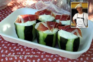 - U drugoj posudi umiješati neki dobar mladi kravlji sir sa kašikom pavlake, sitno sjeckanim čenjom bijelog luka i malo začinskog bilja, posoliti i pobibriti. Zatim sa tom smjesom puniti izdubljene krastavce.