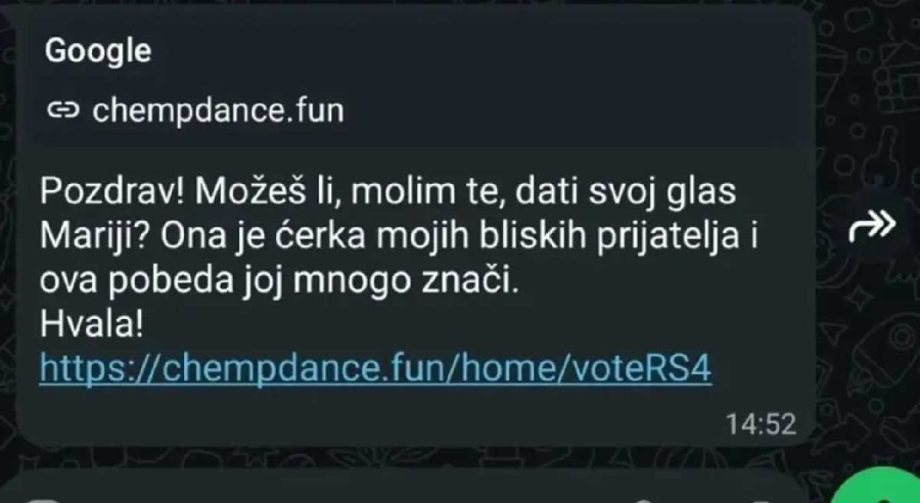 “Pozdrav! Možeš li, molim, dati svoj glas Mariji? Ona je ćerka mojih bliskih prijatelja i ova pobjeda joj mnogo znači”, glasi pomenuta SMS poruka, a koju je Telegrafu poslala uznemirena čitateljka koja je kliknula na link i registrovala je telefon, nakon čega joj je ukinut, kako kaže, Vocap nalog.