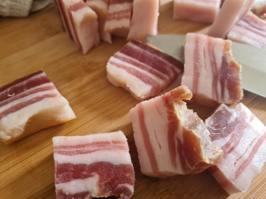 “Moj recept je jednostavan. Za solenje koristim pola morske, pola kuhinjske soli. To je zbog boje mesa koja onda ide na crveno”, naglašava Đukić koji so utrlja u komad slanine, dakle koristi suvi pajc, nakon čega odležava 21 dan. Sitne kosti, tj. koljenice i rebra, tako drži tri do pet dana.