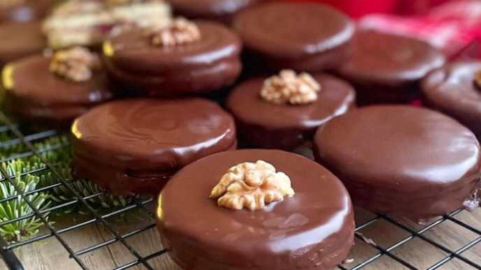 Pomešati u posudi brašno, kakao i šećer, dodati puter sobne temperature i žumance pa umesiti testo. Odmah ga rastanjiti na pobrašnjenoj radnoj površini na debljinu od tri milimetra, pa modlicama (ili čašicama) vaditi kružiće. Slagati ih u lim na papir za pečenje u malim razmacima. Peći u pećnici na 180 stepeni Celzijusovih 13 minuta. Pečene kolačiće ohladiti na limu na kojem su se pekli. Jaja za krem i šećer penasto umutiti mikserom. Kuvati na laganoj vatri (ili na pari) 15 minuta uz neprestano mešanje. Ovaj krem od jaja i šećera se prilikom kuvanja vrlo malo zgusne, ali to ne treba da zavara, dovoljno je kuvati ga 15 minuta i nakon toga ohladiti, opet uz stalno mešanje. Kako se krem bude hladio, tako će se zgušnjavati, ali ako se ostavi da se ohladi sam od sebe bez mešanja, zgrudvaće se. U potpuno hladan krem dodati umućen puter, dobro ga promešati i sjediniti sa kremom, pa njime spajati ohlađene kolačiće, a potom ih premazati čokoladnom glazurom. Čuvati ih na hladnom do služenja.