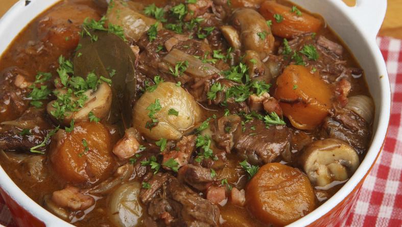 Miješajte dok smjesa ne zakuha pa je ulijte u tavu s mesom i promiješajte. Zakuhajte, pokrijte i kuhajte 45-60 min dok meso ne omekša.