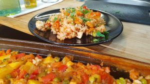 U šerpu sipajte vodu (700 ml) i dodajte kocku supe. Kada se otopi sklonite sa šporeta. U posudu koju ste nauljili sipajte paradajz, grašak, šargarepu, papariku i seckani crni luk. Prethodno povrće operite. Dodajte i pirinač koji ste oprali kao i začine, pa dobro promešajte. Prelijte sa 2/3 bujona od povćra. Pokrijte i pecite na 220°C oko 35 minuta. Zatim skinite poklopac, ako treba dodajte još malo vode ili bujona, pa smanjite temperaturu na 180°C i pecite još 10 minuta. Pospite seckanim peršunom ako želite.