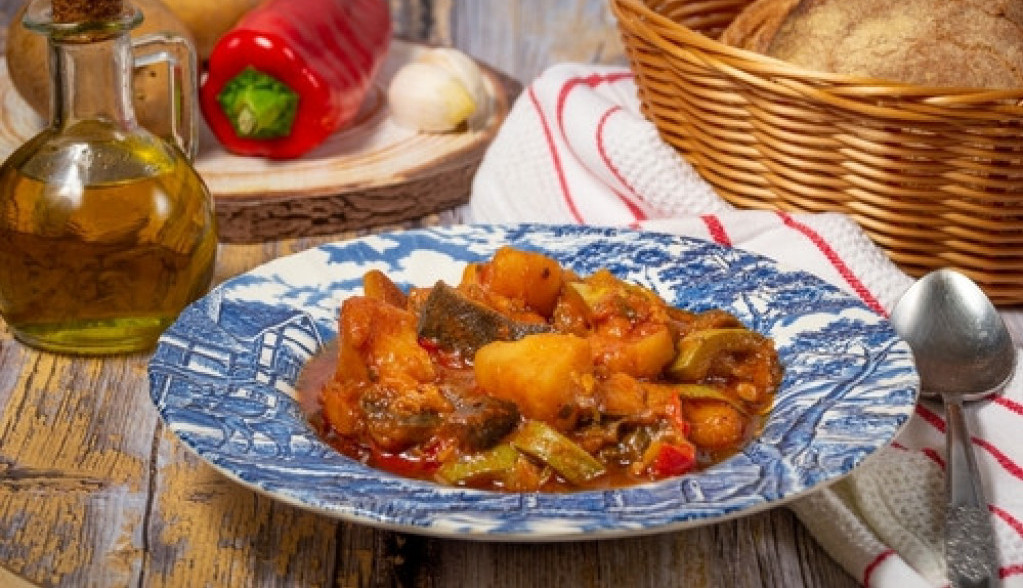 Krompire oljuštite i isjecite na kocke, pa ih stavite u šerpu i nalijte vodom da ogreznu. Crni luk i praziluk sitno isjeckajte, papriku i mrkvu na tračice, pa sve dodajte u šerpu sa krompirom.