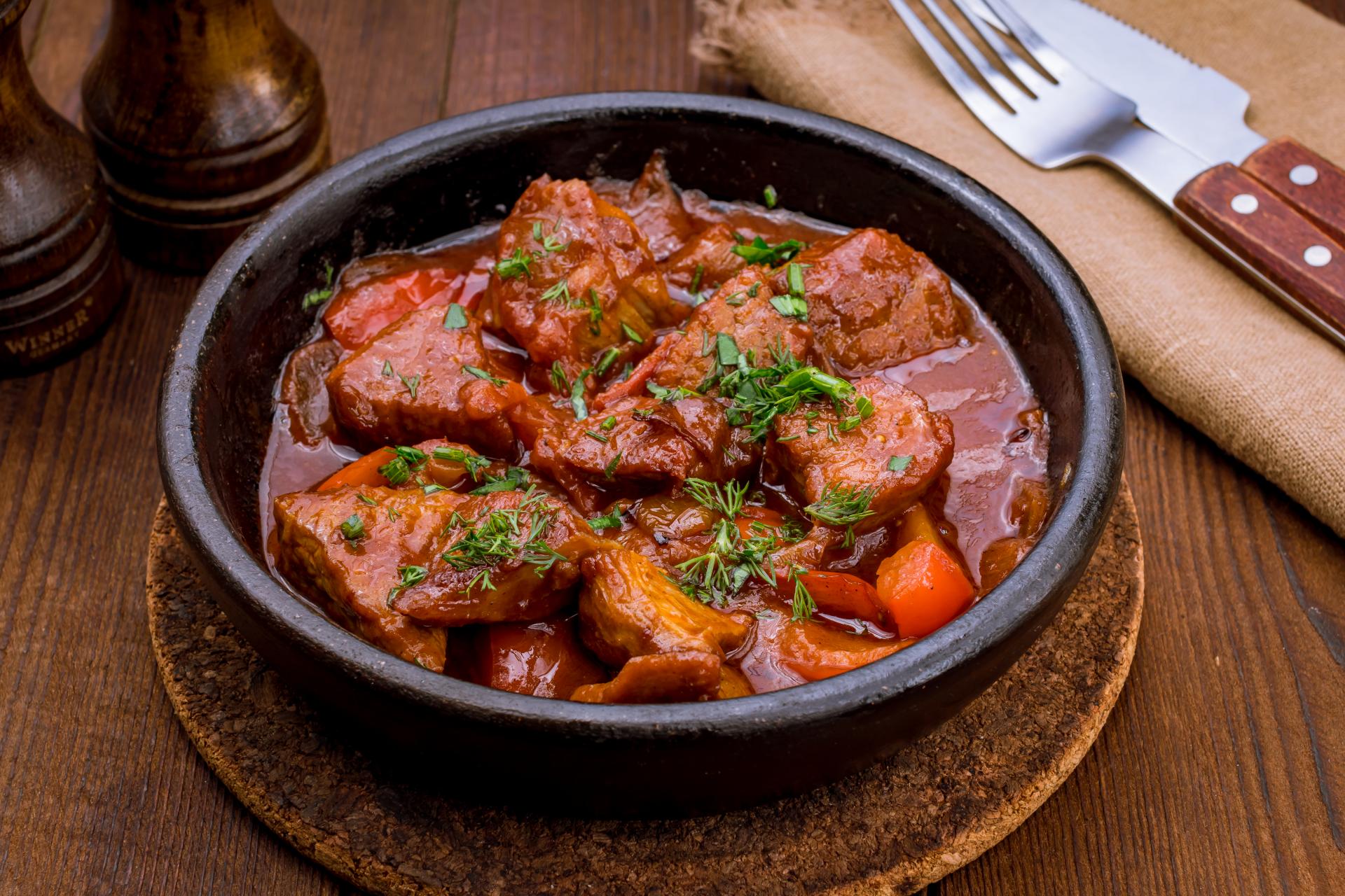 Vratiti meso, staviti malo vode i kuvati na tihoj vatri oko sat vremena. Isjeckati krompir na krupnije kocke, staviti sa mesom i povrćem. Kada je voda skoro isparila, a meso omekšalo i krompir se skuvao, dodajte pavlaku.