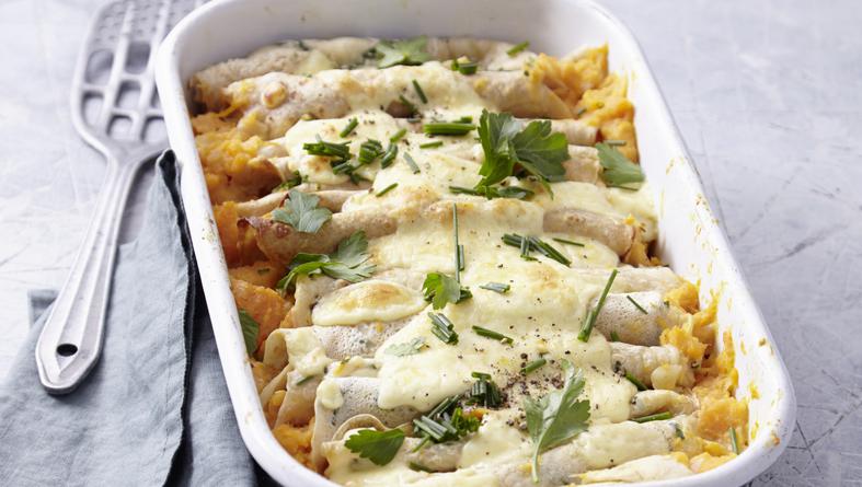 Postupak: U tavi zagrijte maslinovo ulje pa pirjajte nasjeckani luk. Dodati povrće narezano na kockice, zgnječeni češnjak i pirjati još pet minuta. Posoliti i popapriti, dodati pelate. Na kraju ubaciti svježi timijan i bosiljak. Zagrijati pećnicu na 200°C. Palačinke nadjenuti, dodati mozzarellu i preklopiti ih. Složiti palačinke u vatrostalnu posudu i peći desetak minuta. Nakon pečenja, palačinke preliti umakom od grčkog jogurta, začinskog bilja i češnjaka.