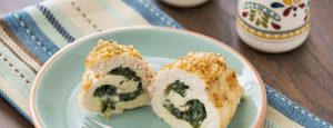 Pileća prsa isjecite na deblje šnicle, posolite i začinite. Svaku šniclu zasjecite po sredini, ali ne do kraja. Špinat isjeckajte sitno, pa ga pomiješajte sa krem sirom, začinima i bijelim lukom u prahu.