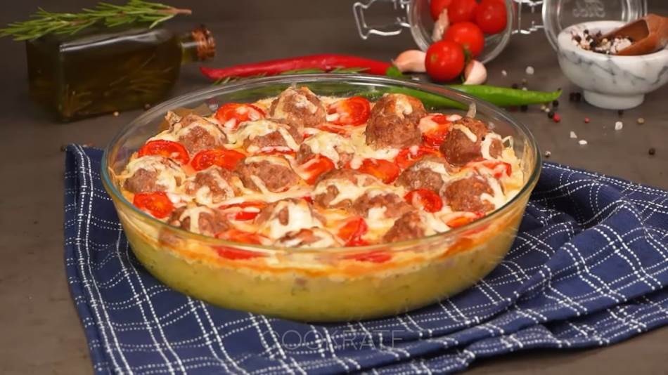 U kuvan krompir dodajte so, biber, mirođiju i puter pa izgnječite. Dobijenu smjesu utisnite na dno vatrostalne posude. U mljeveno meso dodajte jaje, prezle, sjeckan crni luk, so, biber, mjlevenu slatku papriku. Izgnječite rukama smjesu. Formirajte ćufte i stavljajte preko pire krompira. Čeri paradajz isjecite na pola pa svaku polovinu ređajte između ćuftica. Pomiješajte sastojke za sos prelijte preko i pecite na 180 stepeni 35 minuta. Stavite rendan sir pa vratite u rernu na 10 minuta.