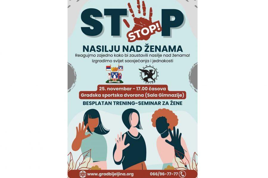 Grad Bijeljina i Udruženje građana „Krav Maga klub Bijeljina“ organizuju 25. novembra u Gradskoj sportskoj dvorani (sala Gimnazije) BESPLATAN trening-seminar za žene pod nazivom „Stop nasilju nad ženama!“