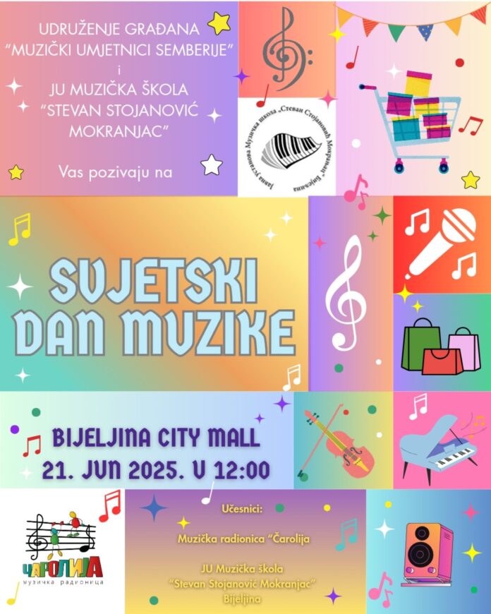 Udruženje građana „Muzički umjetnici Semberije“ i JU Muzička škola „Stevan Stojanović Mokranjac“ pozivaju sve ljubitelje umjetnosti da im se pridruže na proslavi Svjetskog dana muzike, koja će biti održana u Bijeljina City Mallu sa početkom u 12 časova.