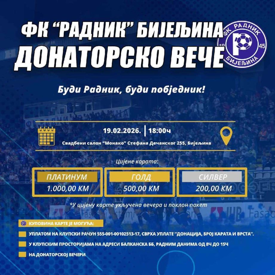 FK “Radnik” Bijeljina obavještava javnost da će se 19. februara sa početkom u 18:00č u svadbenom salonu “Monako” održati Donatorsko veče.