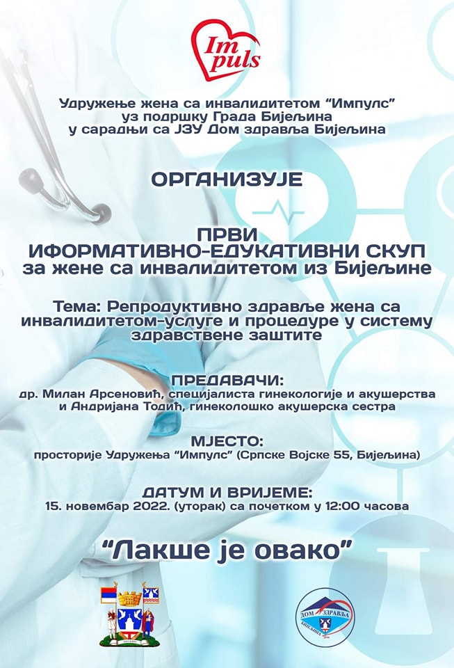 Udruženje žena sa invaliditetom „Impuls“ uz podršku Grada Bijeljina i u saradnji sa JZU Dom zdravlja Bijeljina sa ciljem unapređenja kvaliteta brige o reproduktivnom zdravlju žena sa invaliditetom organizuje prvi u nizu Informativno edukativni skup pod nazivom “Reproduktivno zdravlje žena sa invaliditetom – usluge i procedure u sistemu zdravstvene zaštite” .