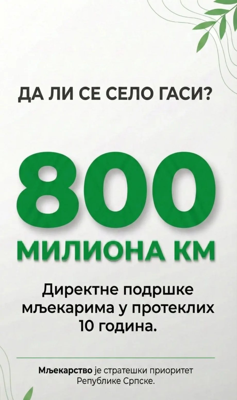 Na pitanje “Da li se selo gasi” iz Ministarstva poljopivrede navode u proteklih 10 godina mljekarima isplaćeno 800 miliona KM direktne podrške