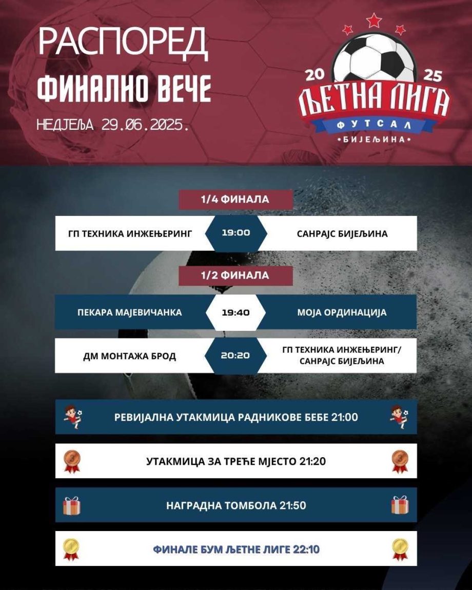 Finalno veče BUM ljetne lige startuje večeras u 19č utakmicom 1/4 finala, nakon čega slijede utakmice 1/2 finala, utakmica za treće mjesto, revijalni program, tombola i veliko finale osme po redu BUM ljetne lige.