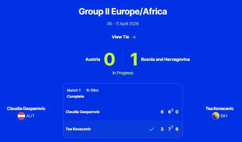 Bod za BiH donijela je talentovana 15-godišnja Tea Kovačević iz Gradiške, koja je savladala Klaudiju Gasparović (21) iz Austrije sa 2:1 po setovima 3:6, 7:6, 6:0.