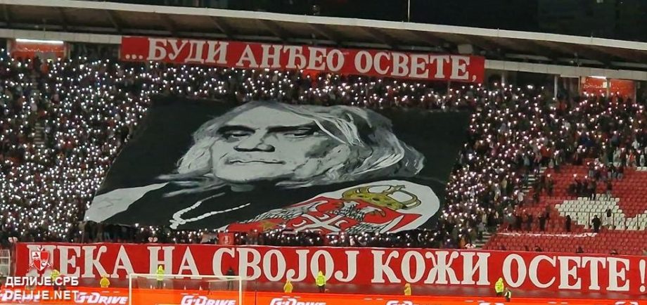 Na tribini gdje su najvjerniji Zvezdini navijači bila je spremna koreografija sa jasnom porukom: “Budi anđeo osvete”, stih iz pjesme “Pogledaj dom svoj anđele”.