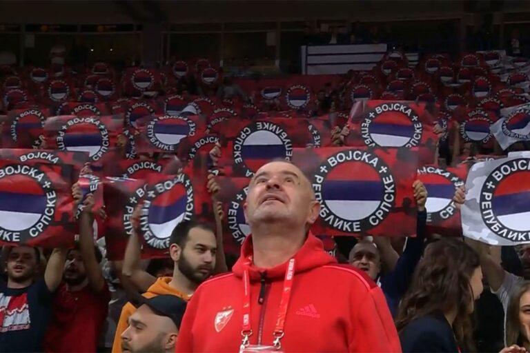 Svi navijači u hali su uoči početka susreta podigli kartone na kojima je bio grb vojske Republike Srpske.