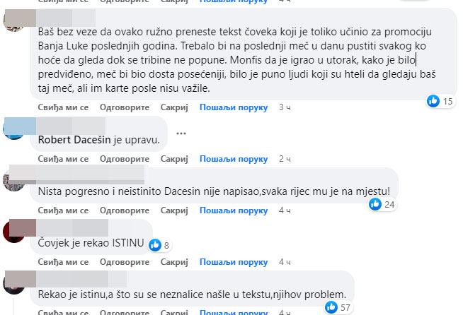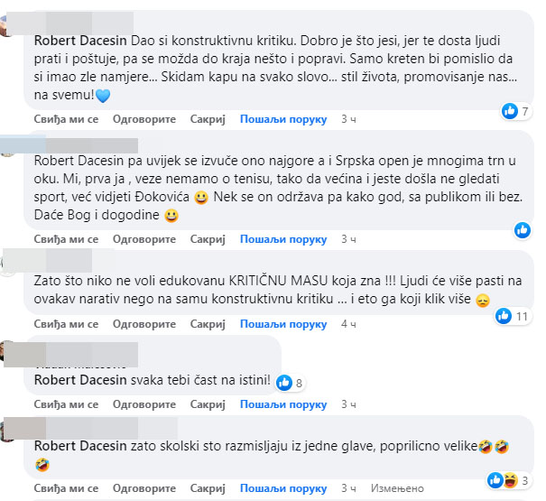 Brojni mediji objavili su danas kako je poznati bosanskohercegovački putopisac i “travel bloger” Robert Dacešin, kritikovao navijače Srpska open, pa dobio žestoke odgovore.Međutim, Dacešin se oglasio komentarom, da su mediji očito u negativnom smislu prenijeli jedan ovakav komentar pored 500 i više koji misle isto kao on, odnosno da Banjalučani očito vole gledati Novaka, a ne tenis.