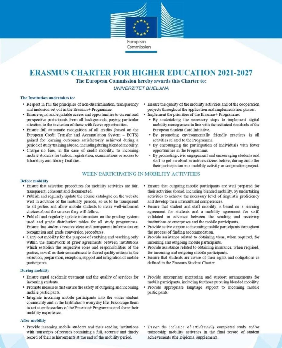 Uspješnim apliciranjem poečtkom 2023. godine Univerzitet Bijeljina je dobio Erasmus povelju za visoko obrazovanje 2021 – 2027 od strane Evropske komisije. Ova povelja propisuje principe i načela koji moraju biti poštovani tokom aktivnosti razmjene osoblja i studenata, kao i prilikom učešća u Erasmus evropskim i međunarodnim projektima. Ova povelja predstavlja potvrdu i akreditaciju Univerziteta od strane Evropske komisije da istraje i bude aktivniji na polju realizacije Erasmus projekata, kao i projekata razmjene osoblja i studenata.