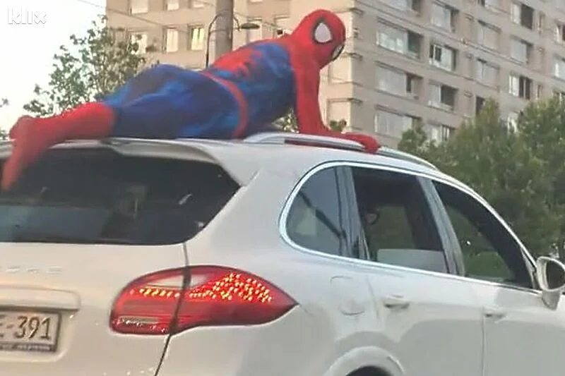 Vidljivo je da se osoba, odjevena u kostim spomenutog filmskog junaka, u ležećem položaju drži za krov terenca, a da pri to nije bila dodatno osigurana.