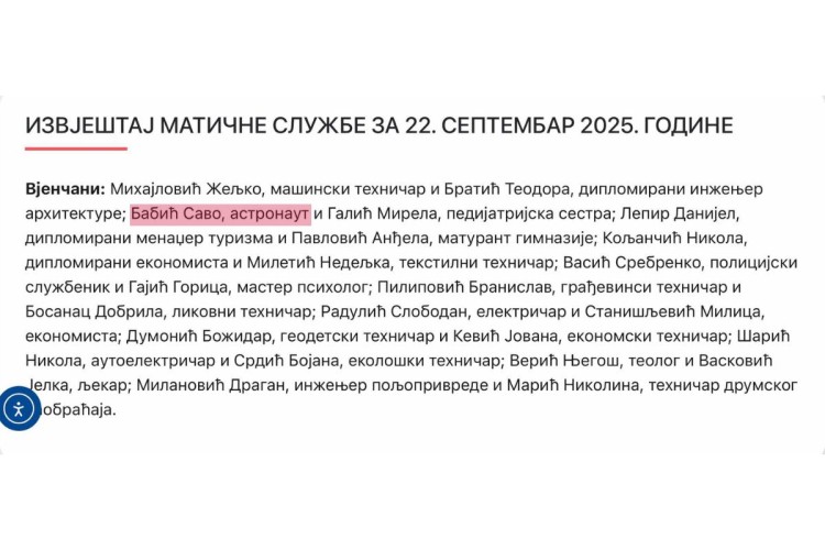 Matična knjiga vjenčanih u Banjaluci od vikenda broji i jednog “astronauta”. Naime, u rubriku “zanimanje” mladoženja Savo Babić je, bez mnogo razmišljanja, odlučio upisati upravo to – astronaut.